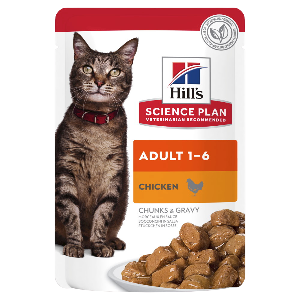 Pisica ta va aprecia gustul hranei HILL'S SCIENCE PLAN Adult cu bucăţi de pui în sos. Are un echilibru perfect de gust şi nutriţie şi este special creată pentru a susţine necesarul de energie al pisicilor adulte. Conține ingrediente de înaltă calitate, uşor de digerat.